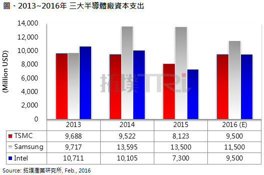 2016年三大半導體廠資本支出總和年成長達5.4%